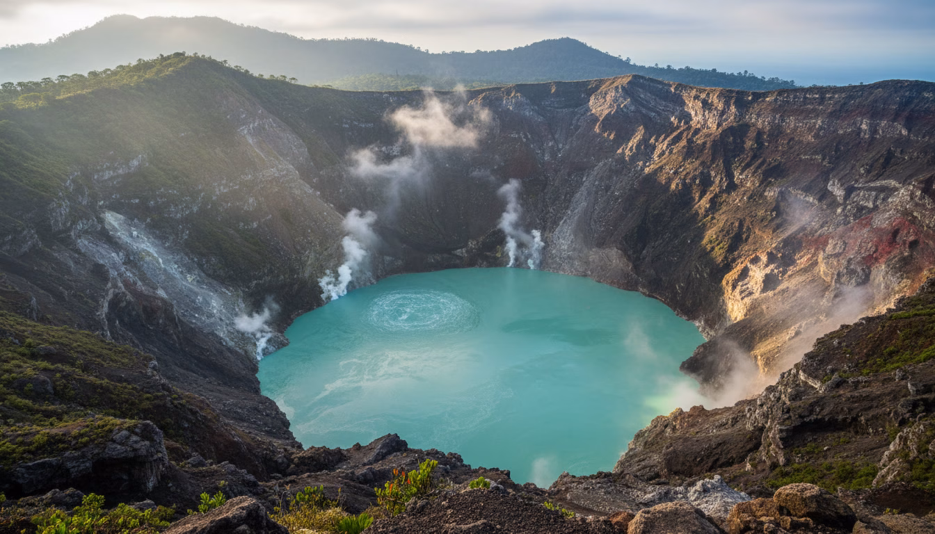 À quelques centaines de mètres du cratère principal se trouve la lagune Botos, nichée dans un ancien cratère endormi depuis 7 500 ans. Son eau froide affiche une couleur vert émeraude, entourée d’une végétation dense et brumeuse. Le contraste avec le lac acide bouillonnant du cratère voisin est saisissant.